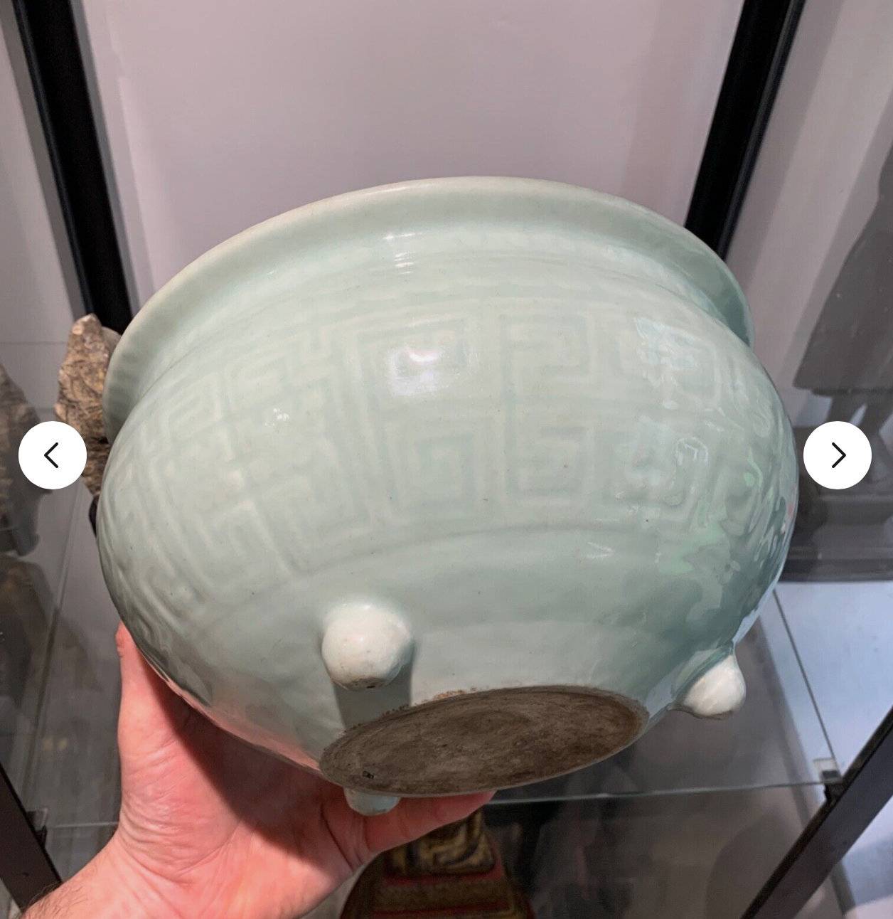 藏友你好:你图片所发这是一件清代中期豆青釉雷纹三足香炉,其造型规整,釉面温润,釉色纯正,纹饰流畅,胎质干爽,包浆自然,为清代中期真品。全品估价中大千元左右!