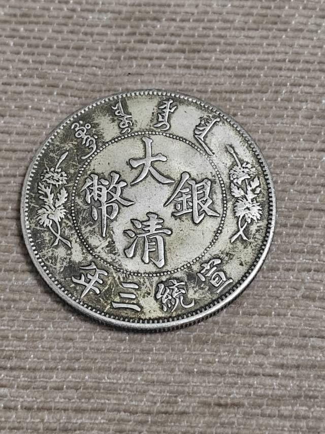藏友你好:你图一所发宣三,其钱纹绵软,压力感不足,银色不正,材质及铸造工艺现代,是一枚合金所铸的仿品。图三所发三年大头,是的一枚真银所铸的假币。图八所发大清铜币,真品,磨损比较厉害,小十元以内一枚。