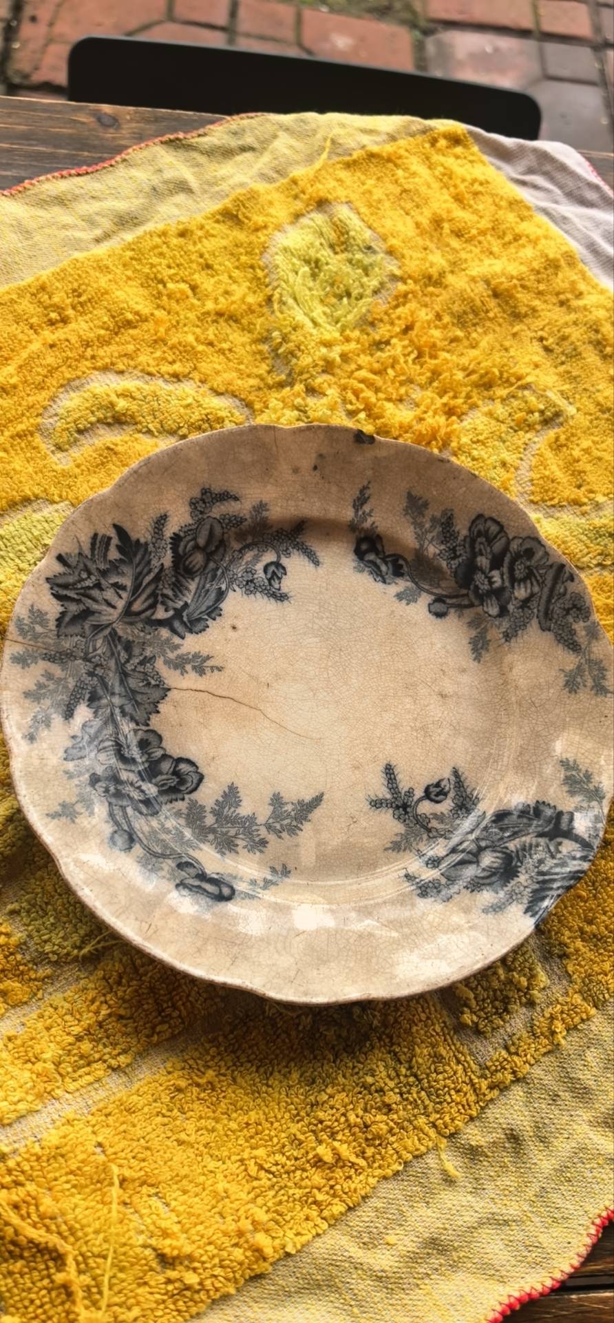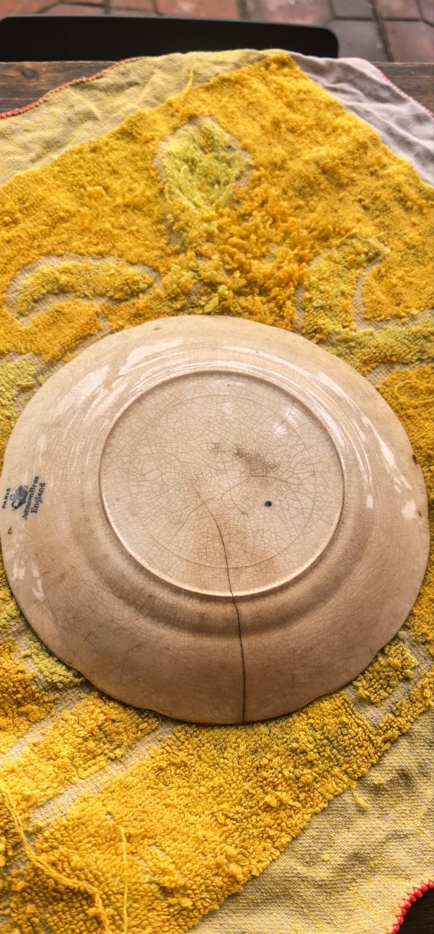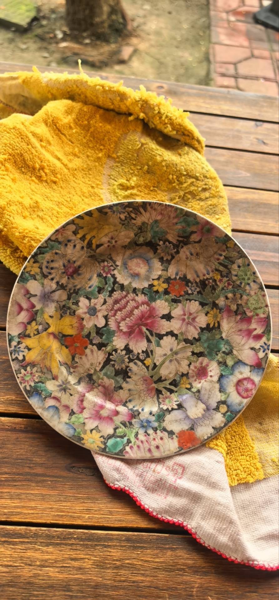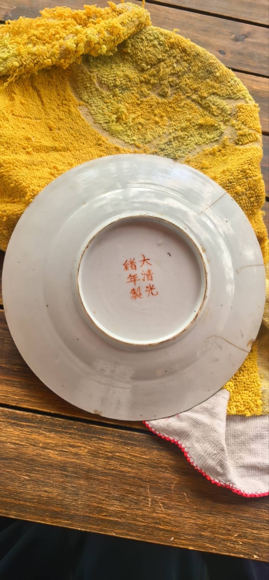 藏友你好:你图一所发这件墨地粉彩百花纹盘,其造型舒展,釉面温润,纹饰流畅,包浆自然,是民国时期真品,惜品相不佳,估价中百左右。图三为民国时期英格兰瓷盘,真品,品相也不好,估价小百元以内。
