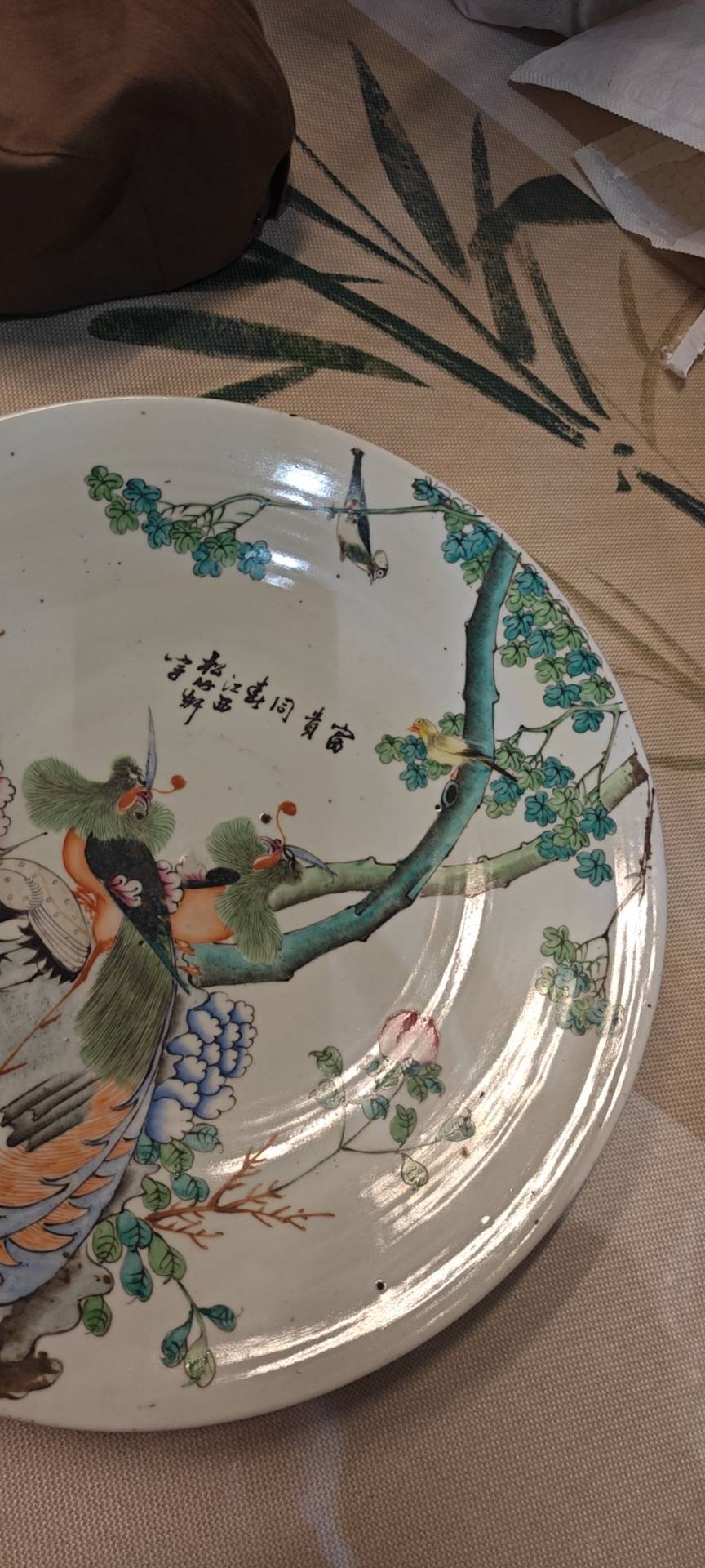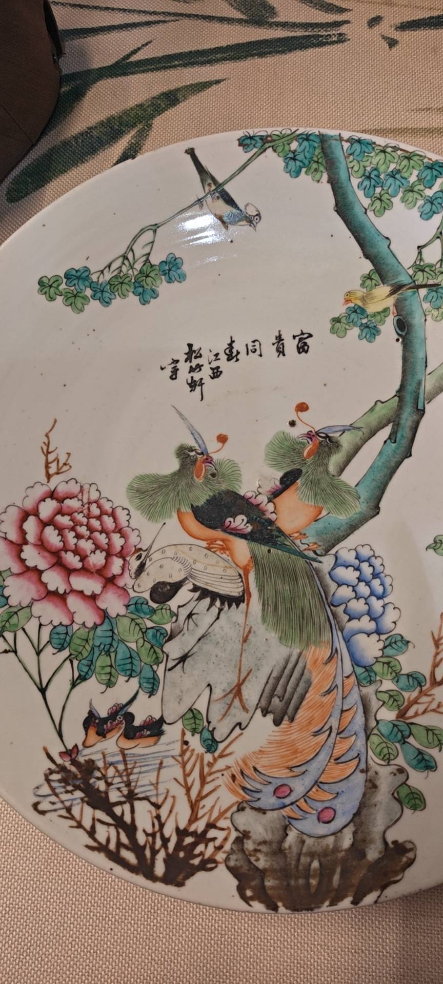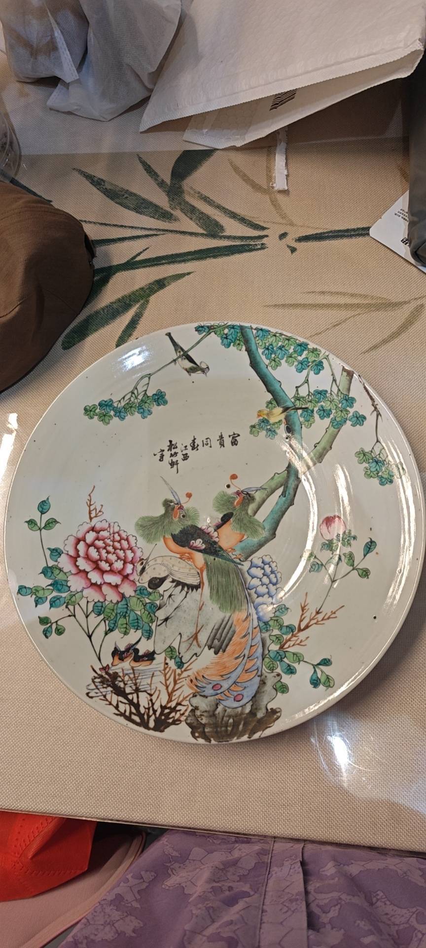 藏友你好:你图片所发这件粉彩五伦图大盘,其造型舒展,釉面温润,纹饰古雅,用彩纯正,修足娴熟,胎质干爽,为民国时期真品。全品估价三四千元左右。