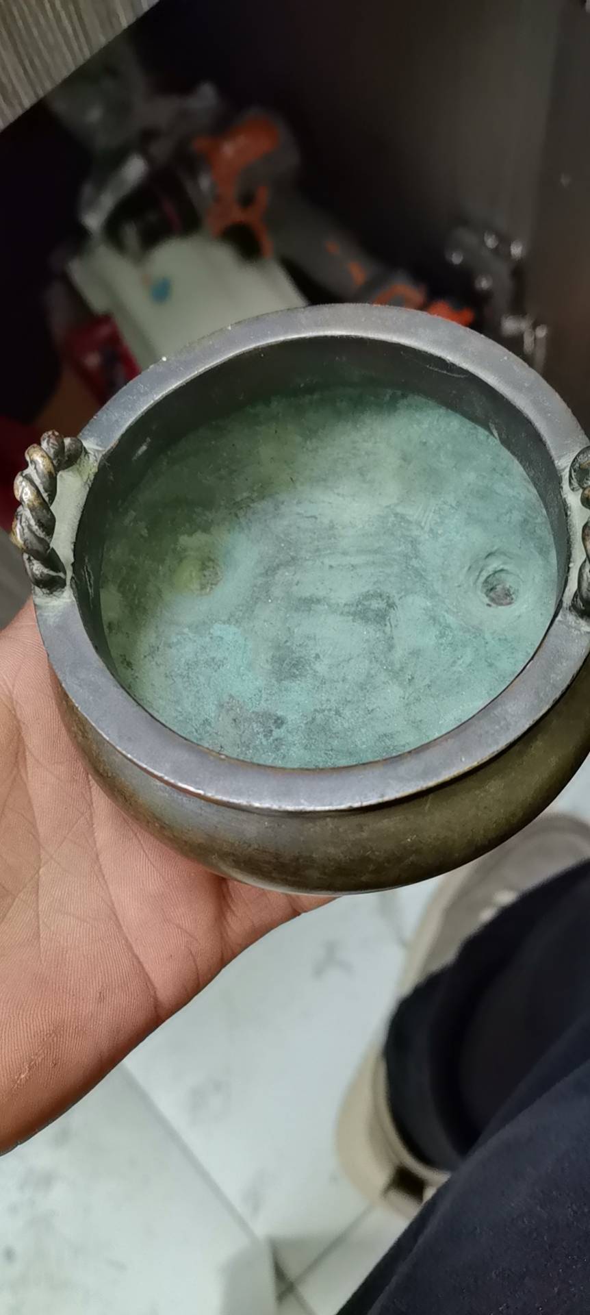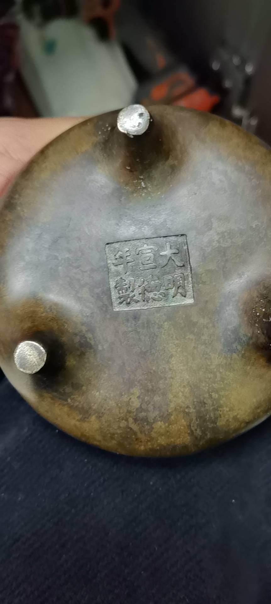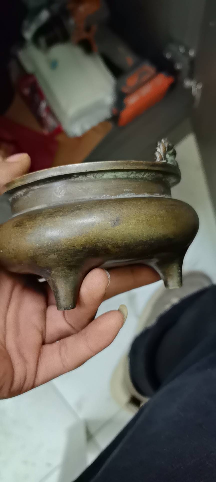 藏友你好:你图片所发这件宣德款绳耳鬲式炉,其造型呆板,包浆及锈迹浮浅,器身火气重,材质和铸造工艺现代,是一件现代仿清代中期风格的器物,不建议购买收藏。