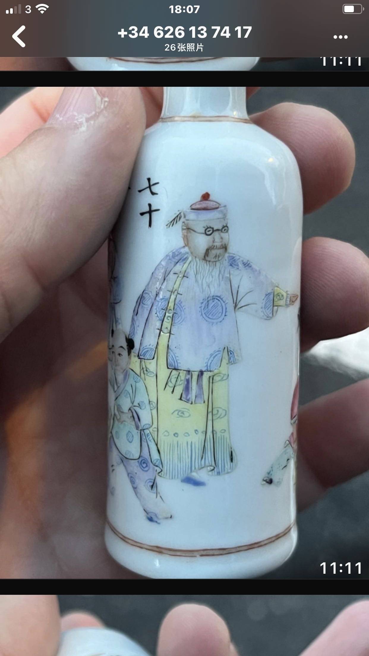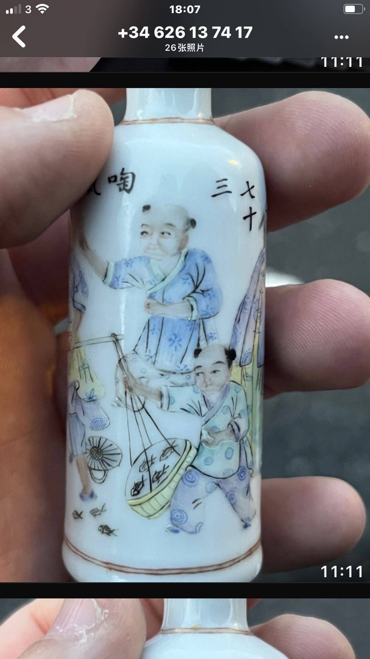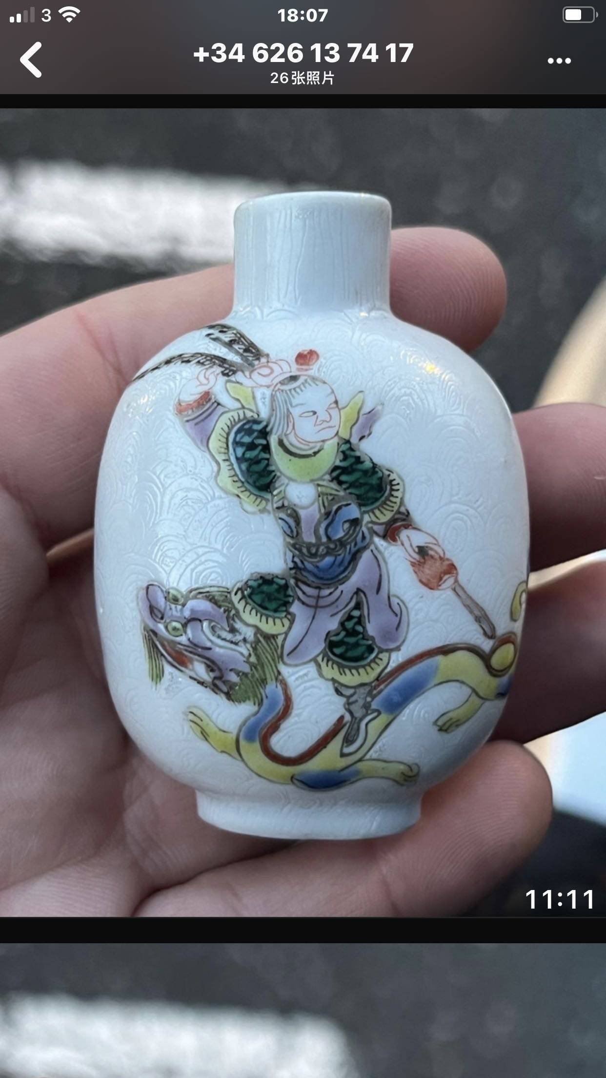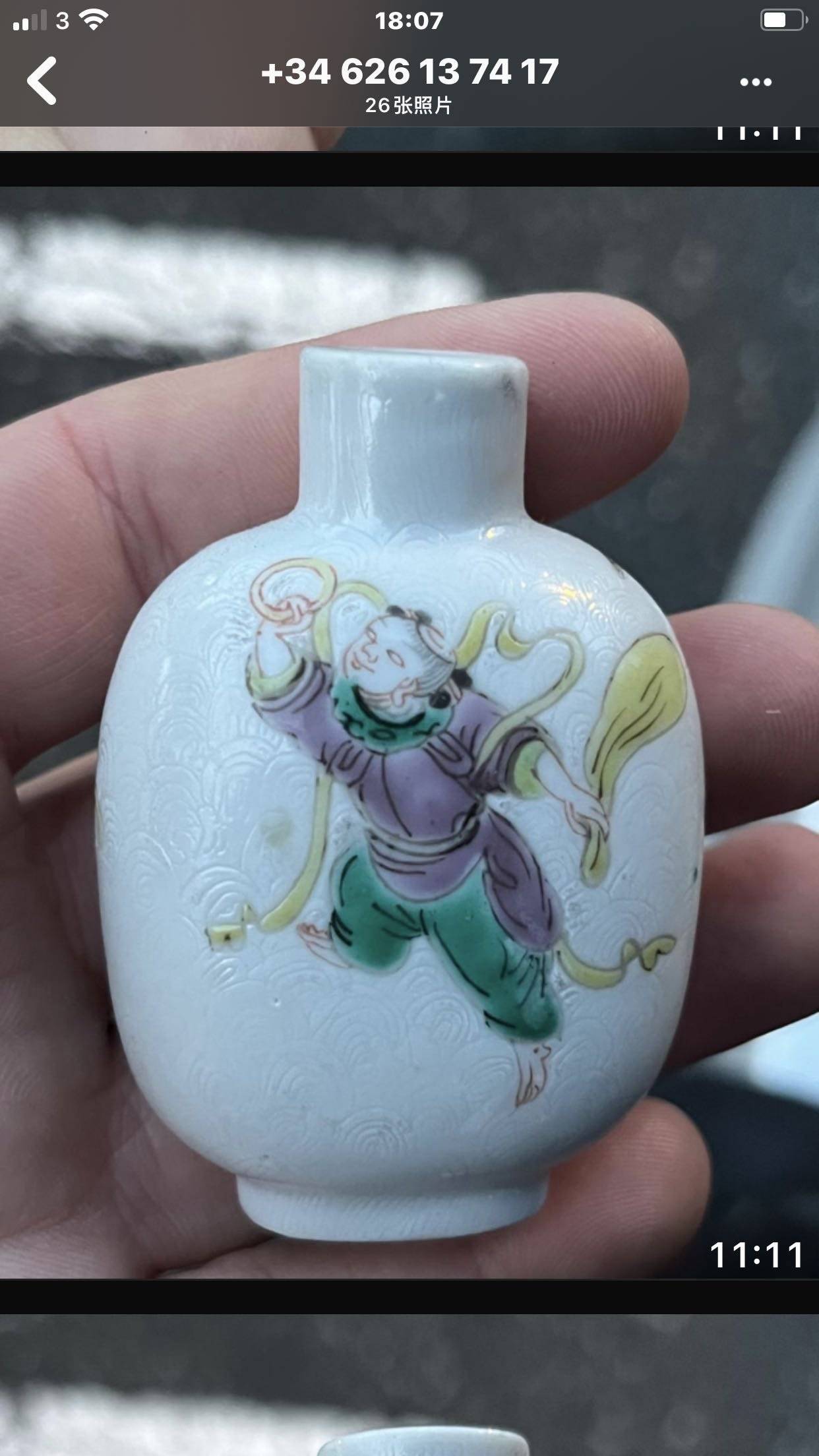 藏友你好:你图一所发粉彩人物纹鼻烟壶,其造型规整,釉面温润,彩料纯正,人物生动,胎质干爽,为民国时期真品,全品估价三四千元。图四五彩扎道哪吒闹海鼻烟壶,晚清真品,全品估价四五千元。图七青花釉里红柳荫双骏鼻烟壶,晚清真品,估价三四千元。