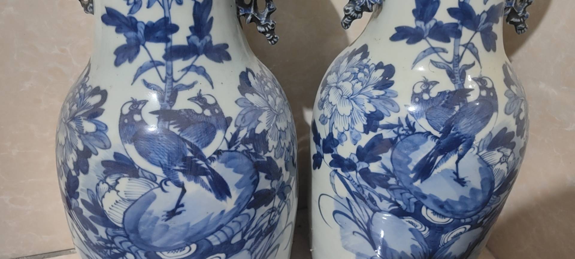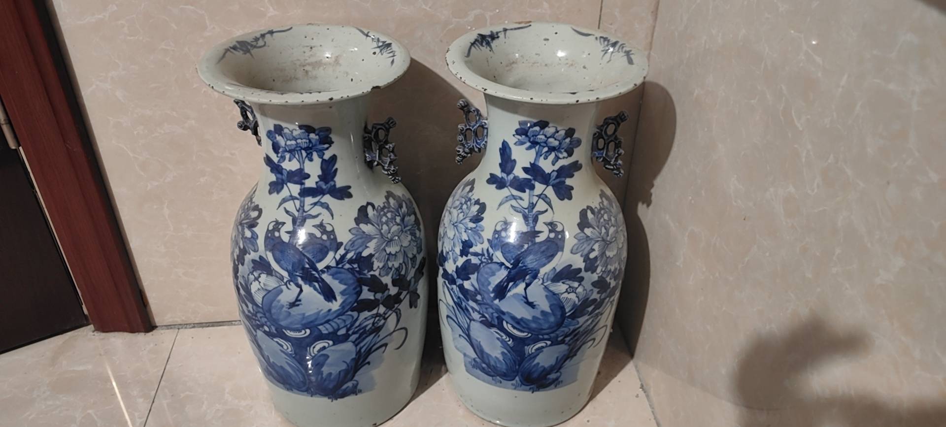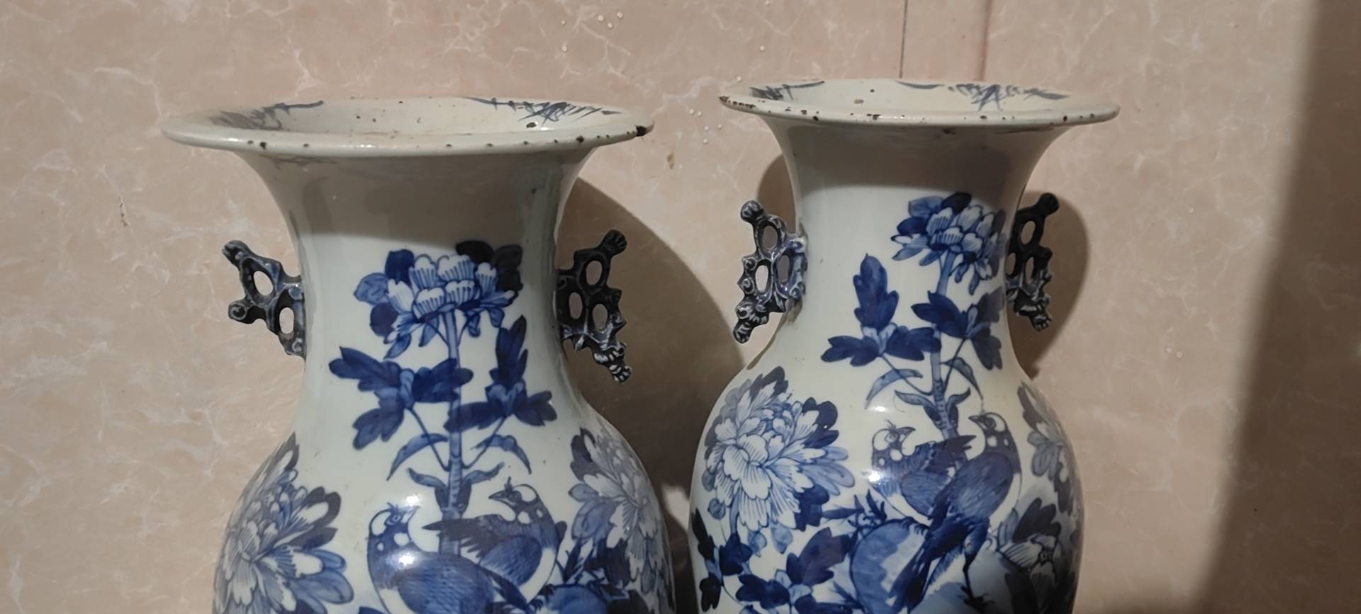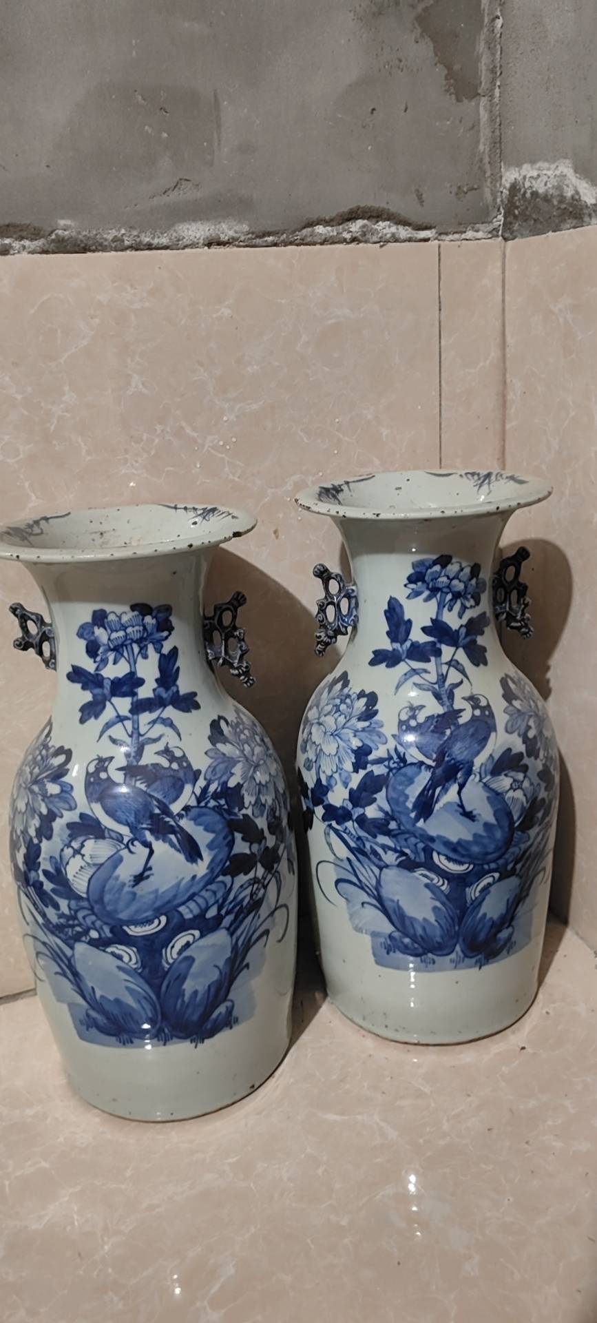 藏友你好:你图片所发这是一对清代中晚期的青花“富贵白头”纹饰题材嫁妆瓶。其造型规整,釉面温润,纹饰流畅,包浆自然,岁月痕迹显著,为清代中晚期真品。惜品相有瑕疵,此品相估价4千左右一对。