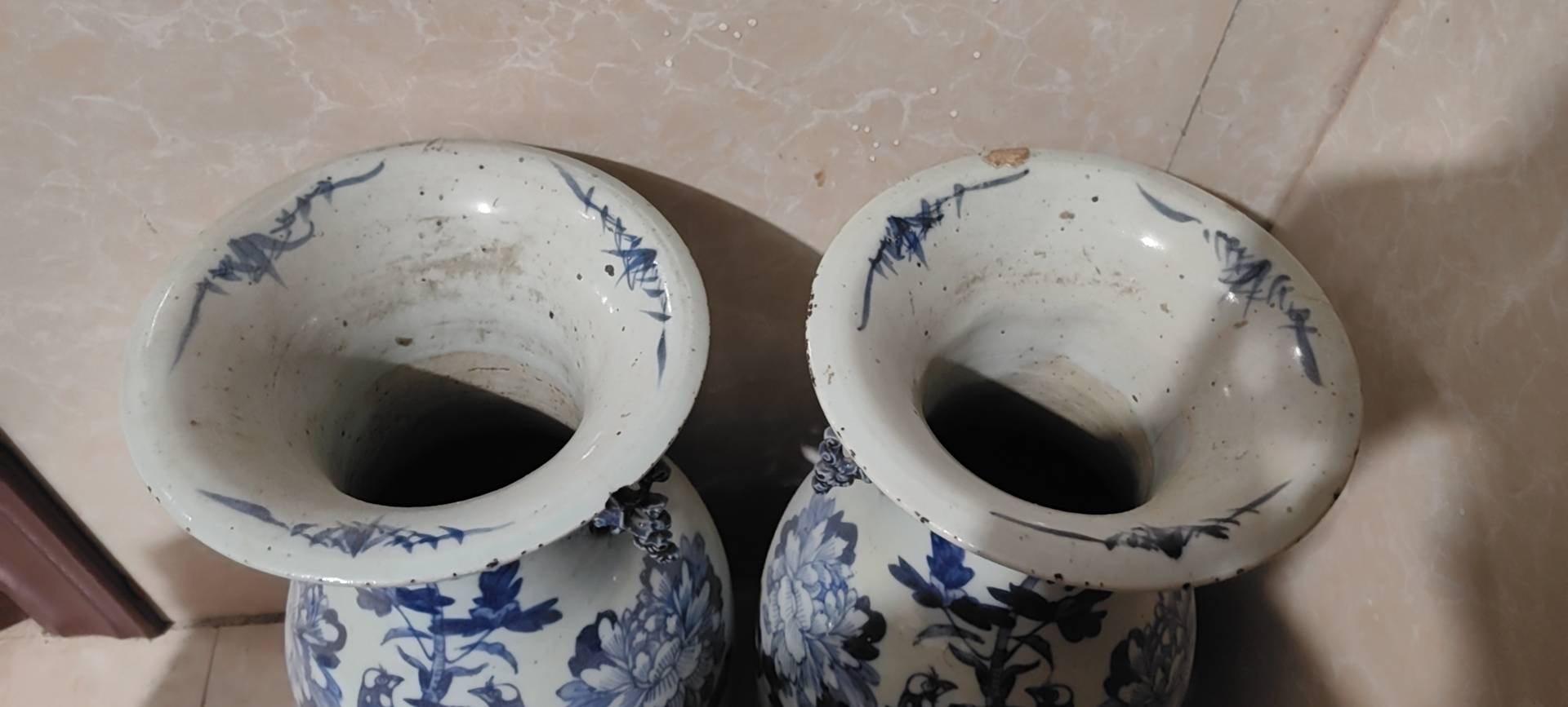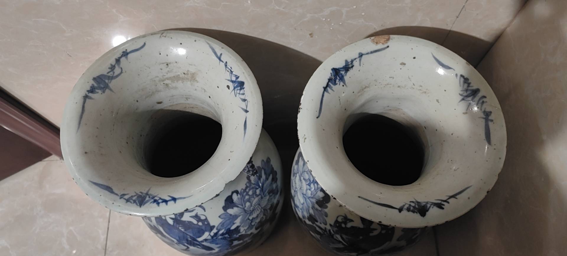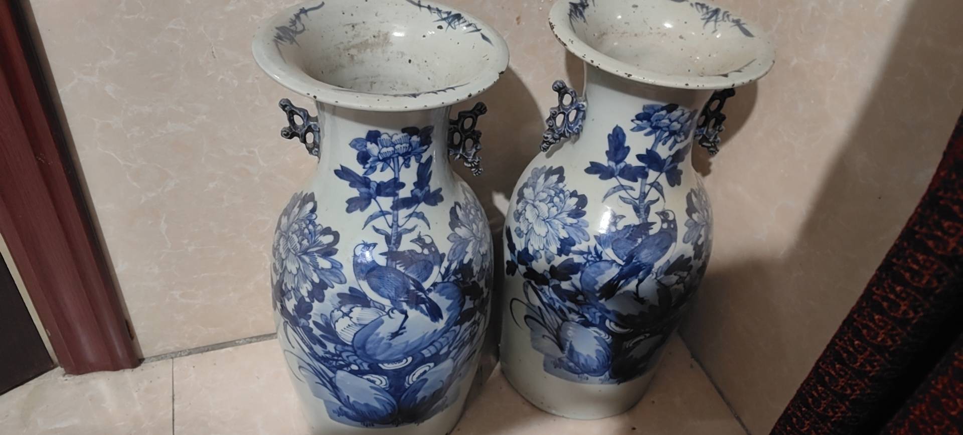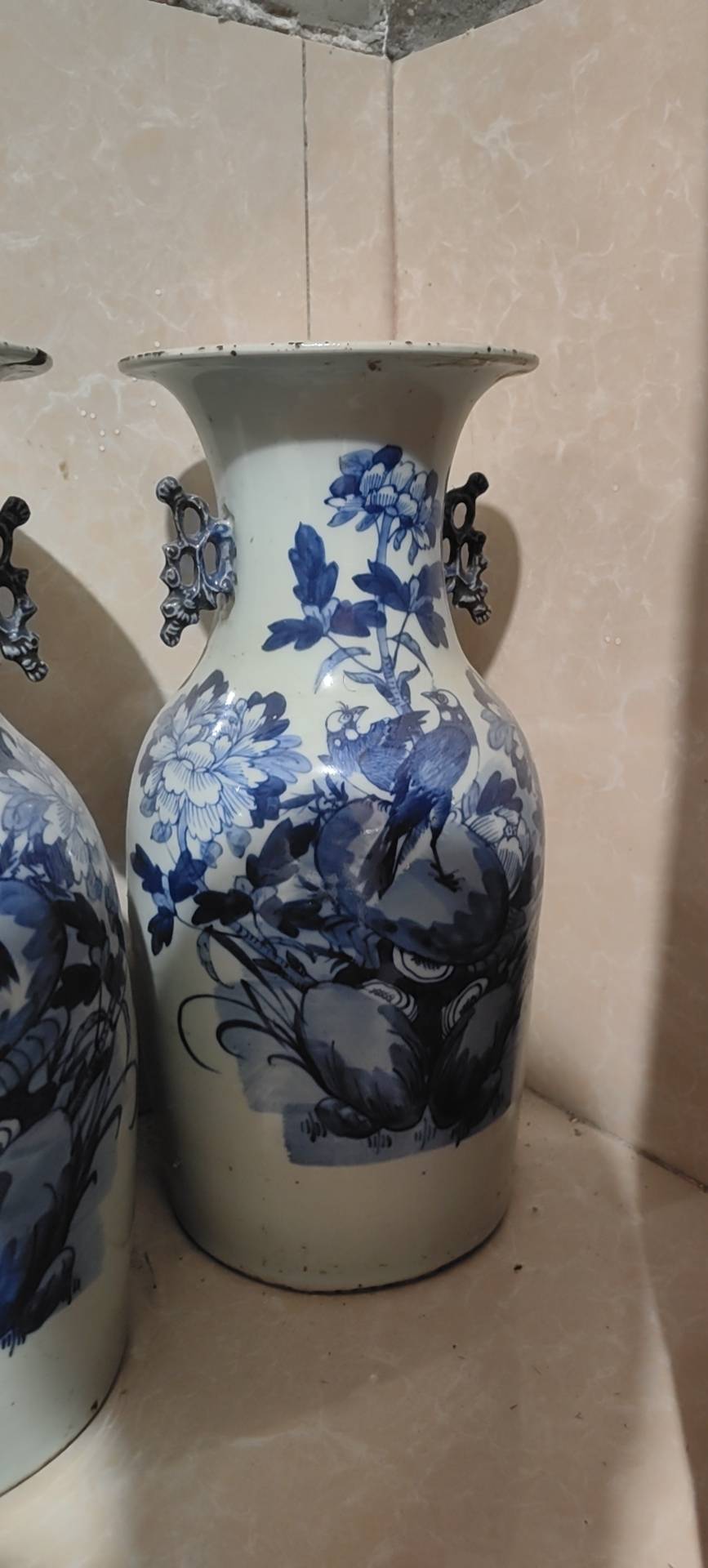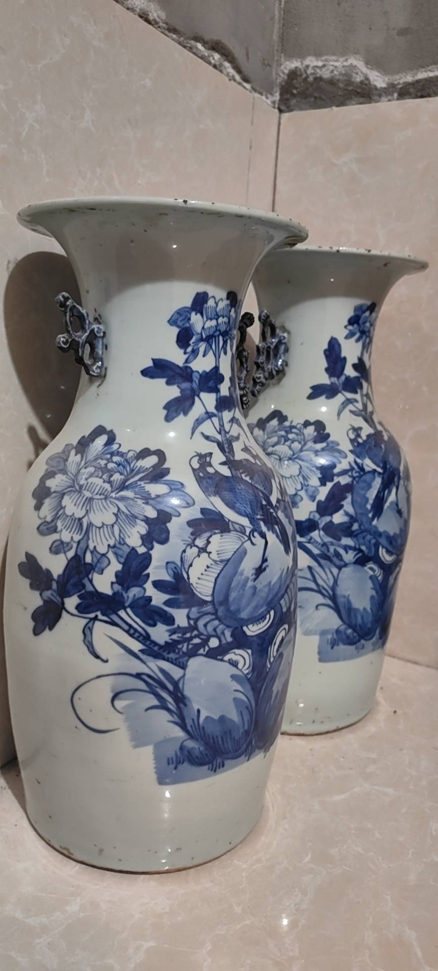 藏友你好:你图片所发这是一对清代中晚期的青花“富贵白头”纹饰题材嫁妆瓶。其造型规整,釉面温润,纹饰流畅,包浆自然,岁月痕迹显著,为清代中晚期真品。惜品相有瑕疵,此品相估价4千左右一对。