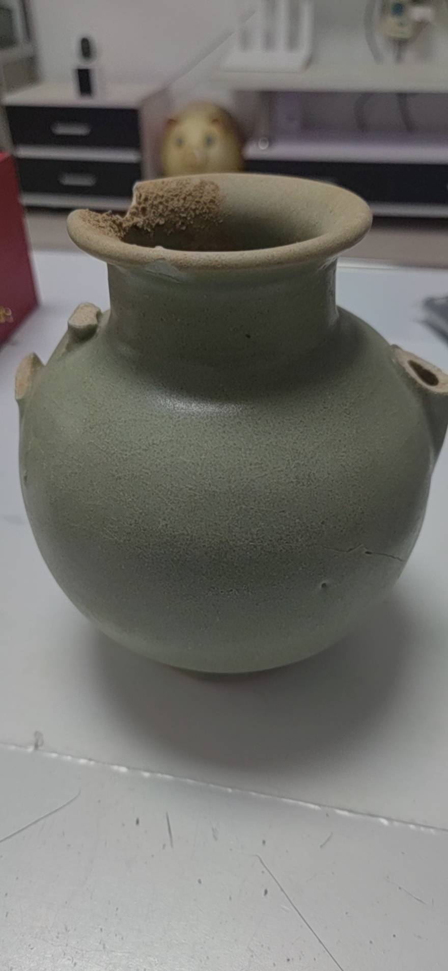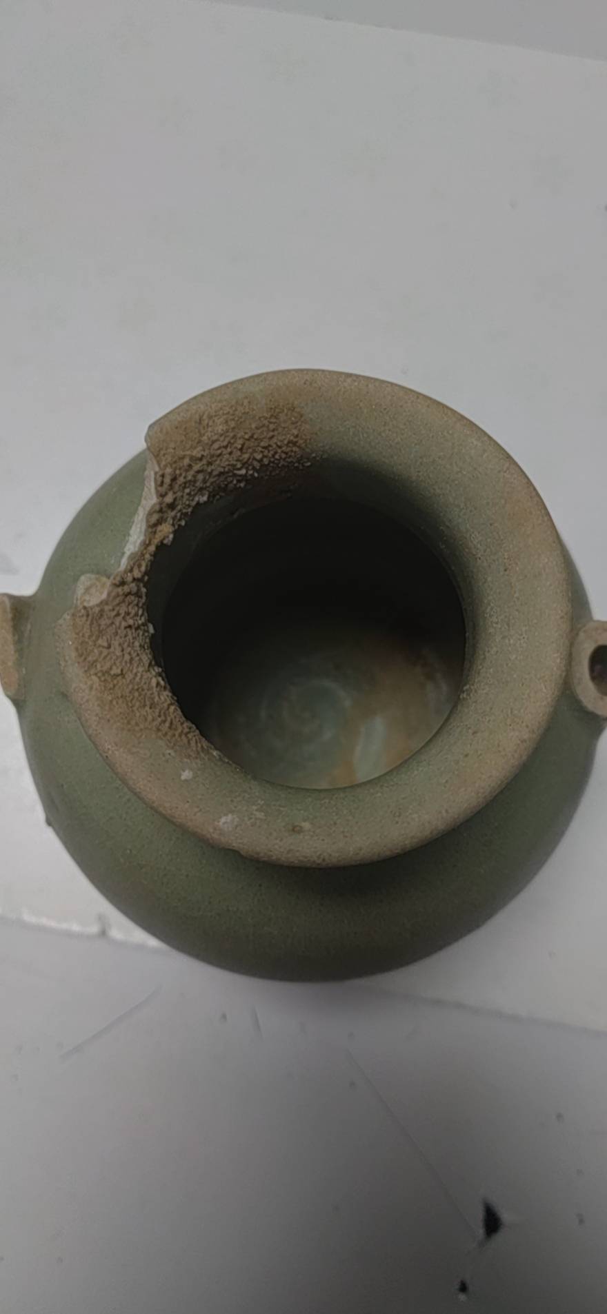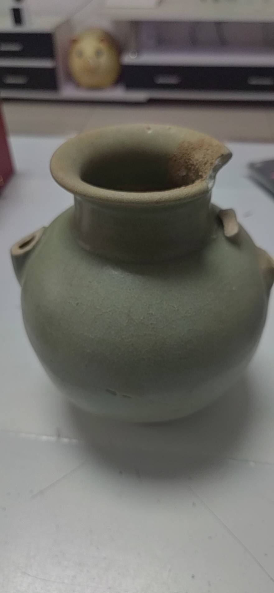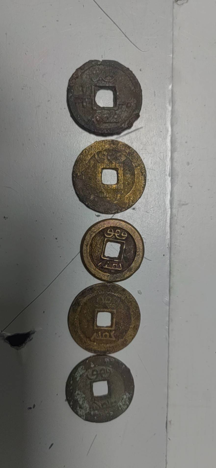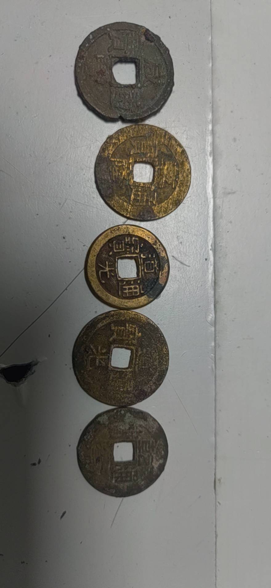 藏友你好:你图一所发这是一件元代龙泉青釉执壶残件,其器物造型规整,沁色入骨,胎质干爽,是一件真品,惜品相不佳,作为标本小千元以内。几枚铜钱也是真品,普通年份及版别,价值不高,小十元一枚。后面是一件小药瓶,不值钱,几十元一个。