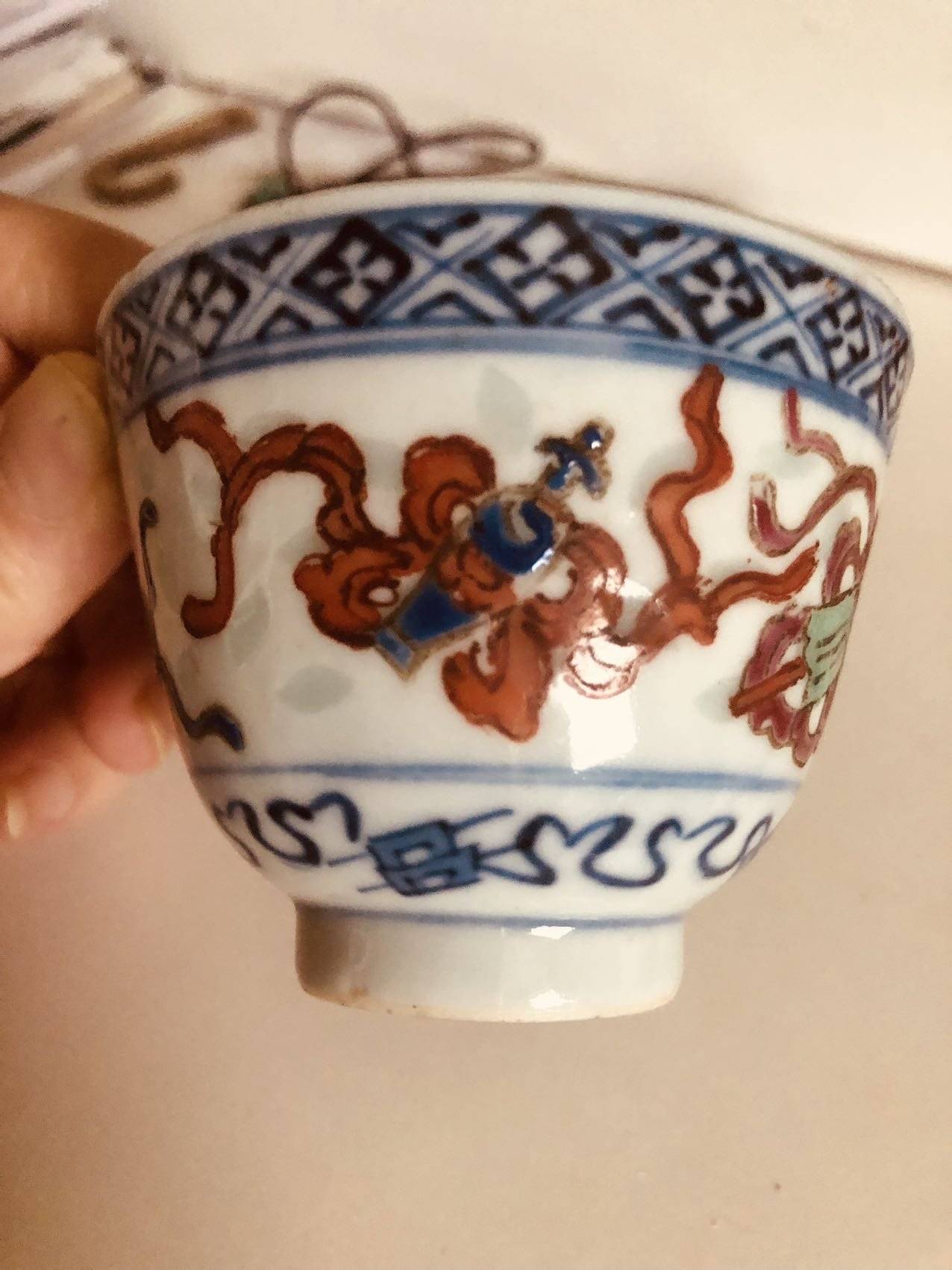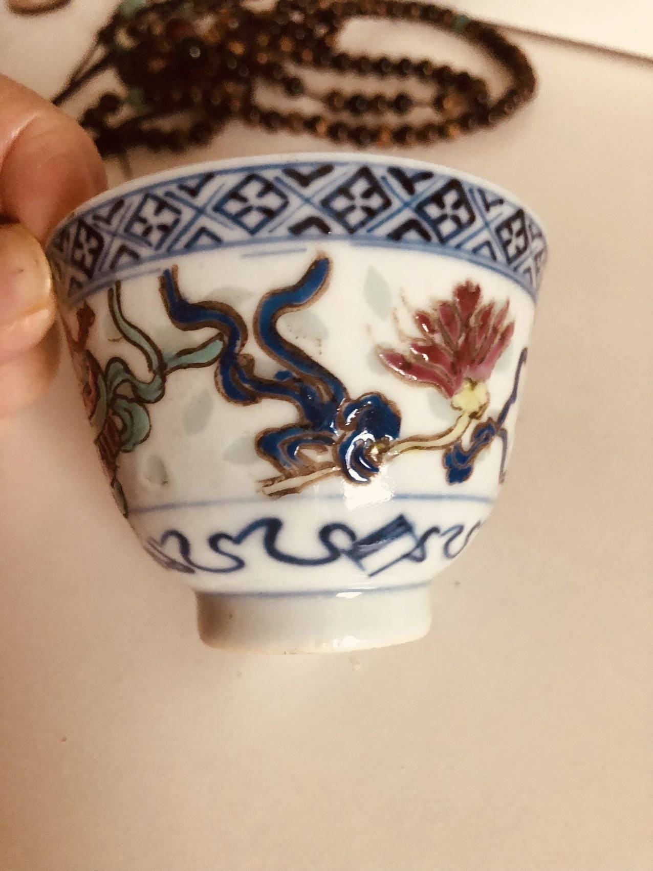 藏友你好:你图片所发这件玲珑粉彩暗八仙茶杯,其造型规整,修足娴熟,胎质干爽,但彩料新嫩且釉面火气重,为晚清的杯子新加的彩,即老胎后加彩,此类一般也属于仿品范畴,不建议购买收藏。