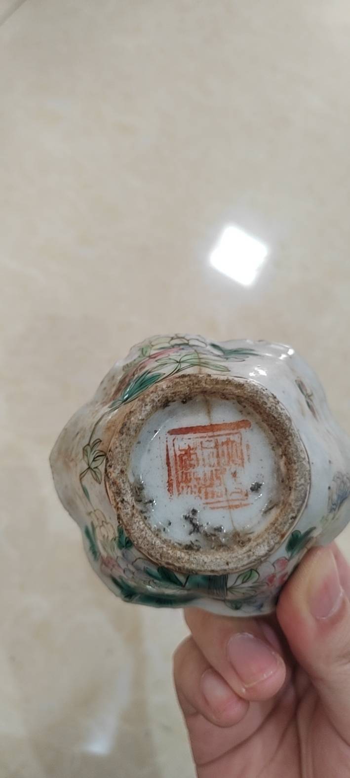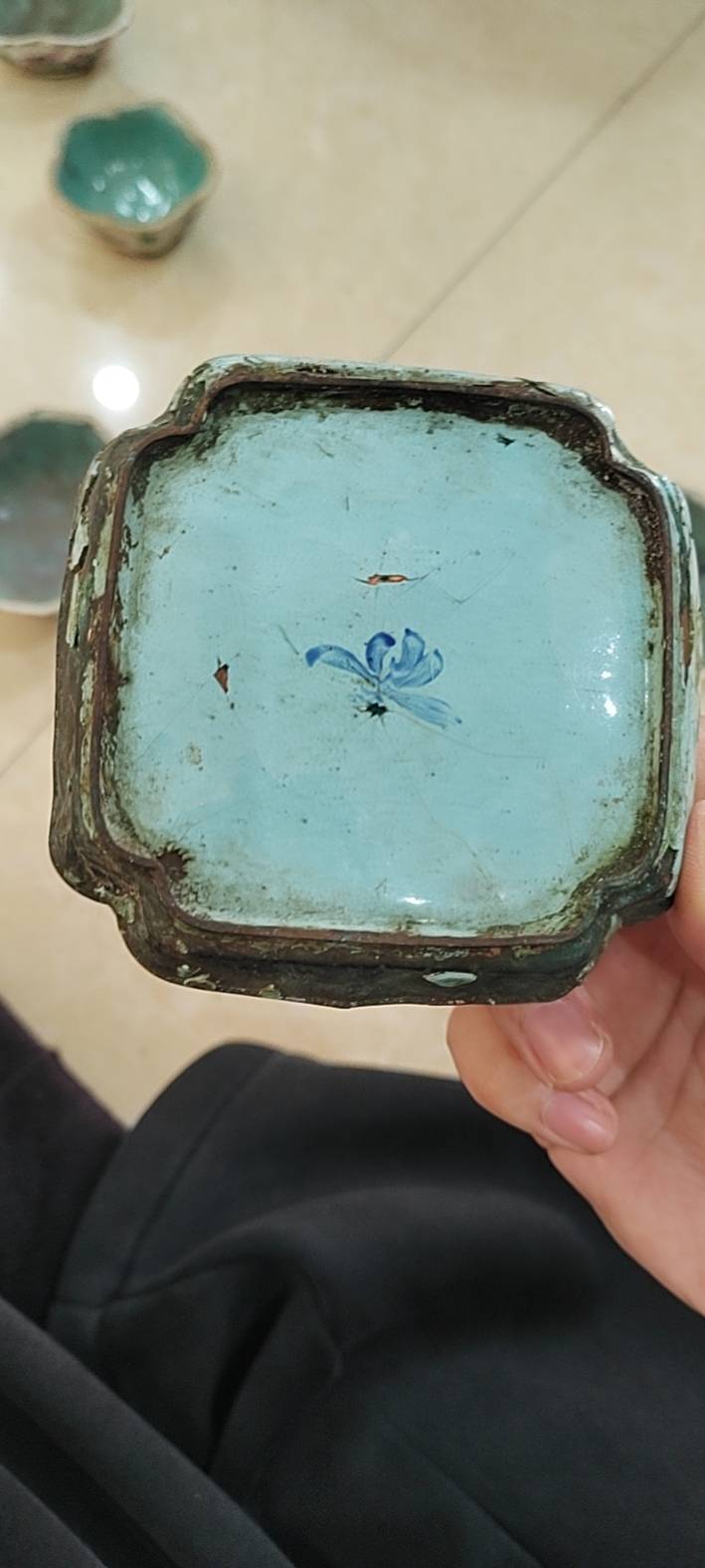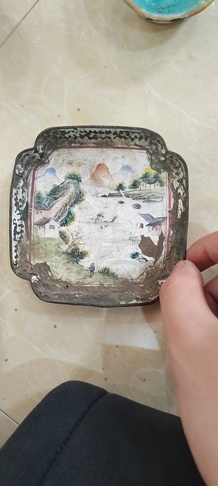 藏友你好:你图一所发粉彩花鸟花口小供碗,其造型规整,釉面温润,纹饰古雅,包浆浑厚,为晚清时期真品,但器身有冲线,对价值影响较大,估价小百元左右,图六也是真品,也有伤,价值也在小百元内。图五和图九两个铜胎加彩小盘为民国真品,有脱彩,价值也是小几百元左右。