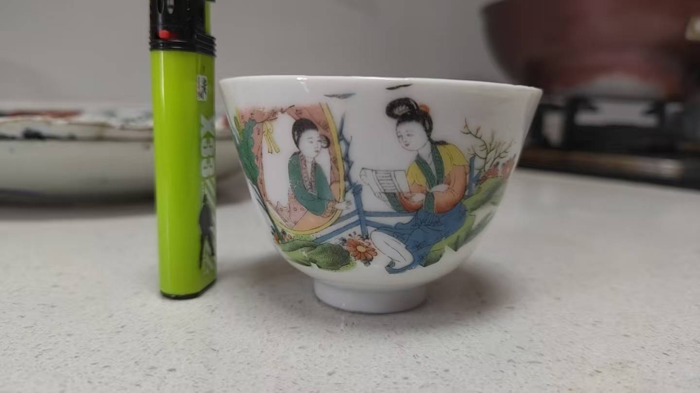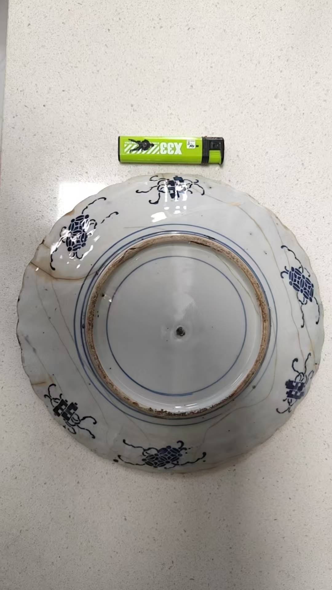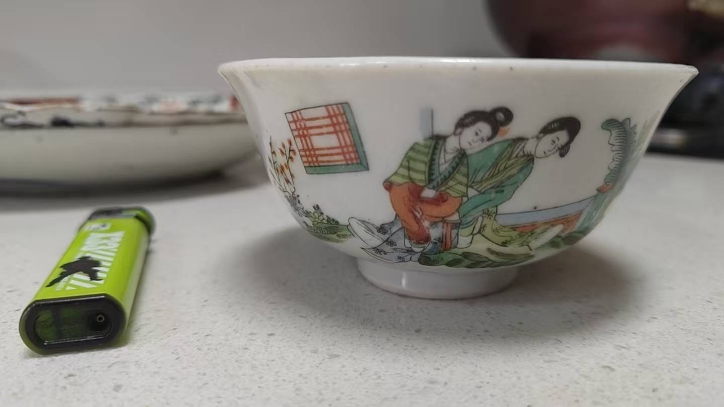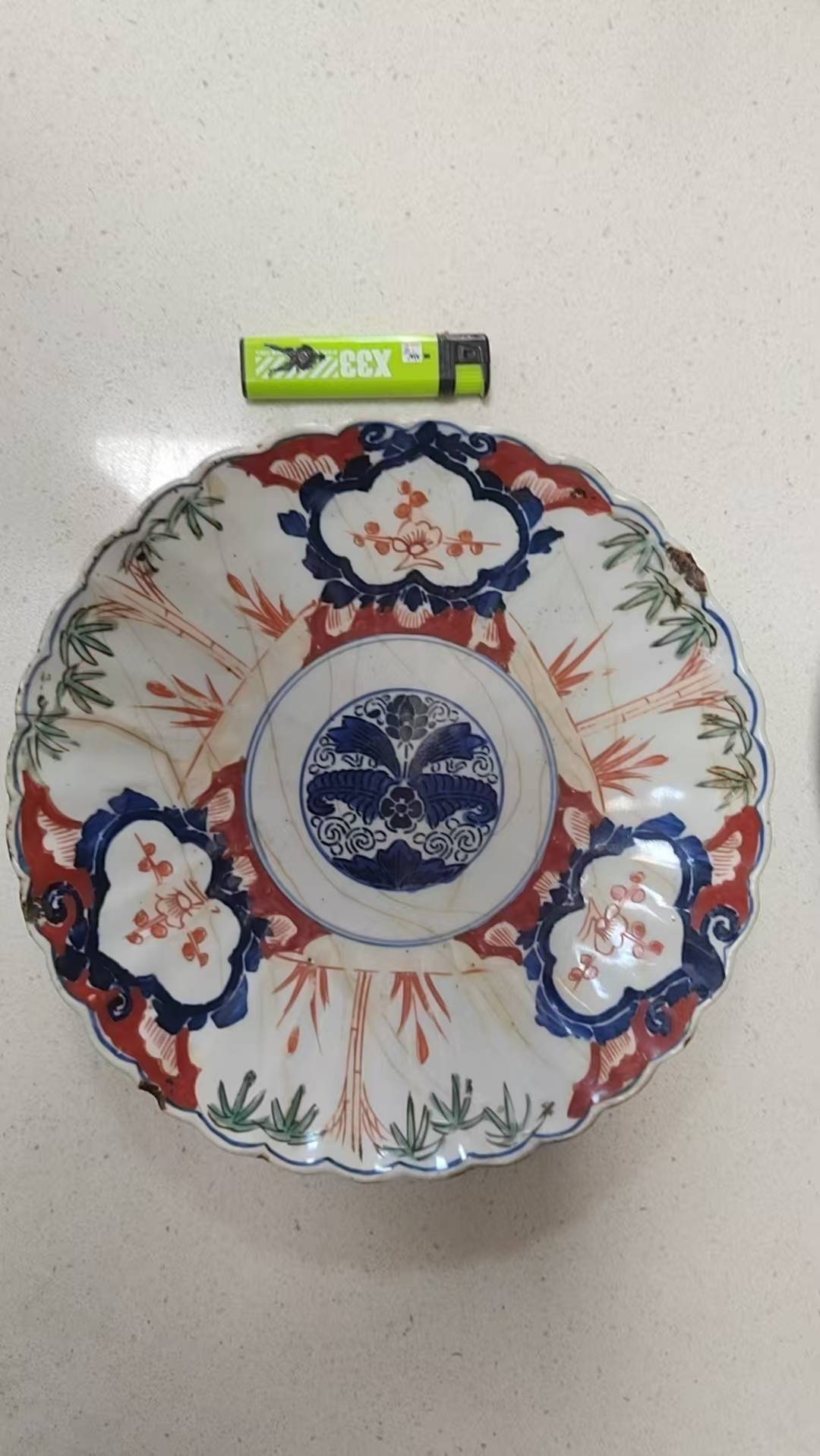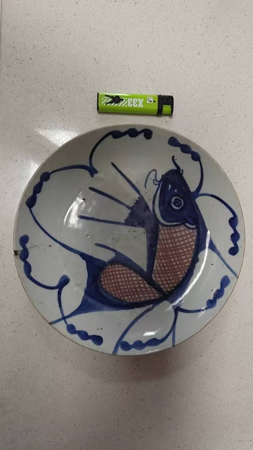 藏友你好:你图一所发为清代中晚期青花釉里红鱼澡纹盘,真品,有瑕疵,估价中百左右。图三所发为清代晚期日本制造的青花彩绘花口盘,品相较差,加上文化原因,经济价值不高,小百元以内。图六和图九是民国晚期到解放初期的粉彩仕女纹碗杯,小百元一个。